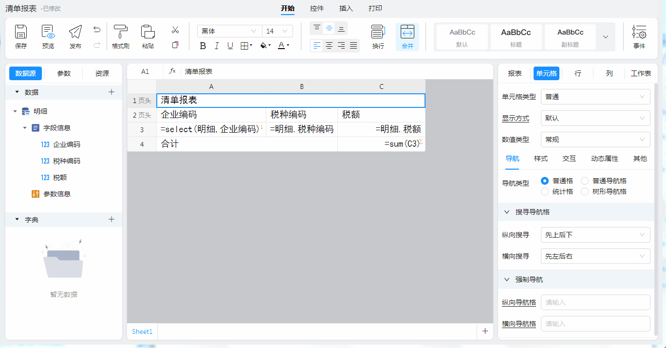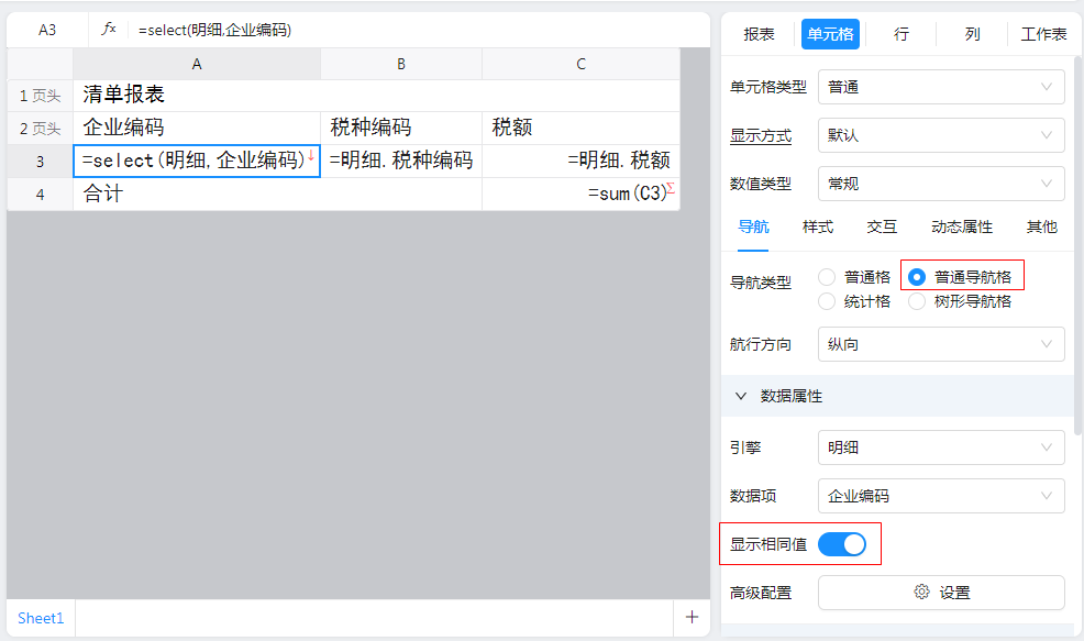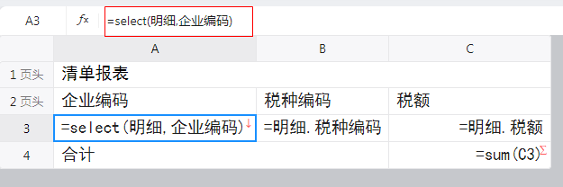 2)第二个变化是,A3单元格的内容由原先的“=明细,企业编码”变成了“=select(明细,企业编码)”。您可以不用管这个表达式如何编写,因为,一般情况下您不需要手动去修改这个表达式。
