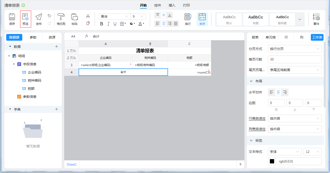 到这里报表设计基本就完成了,我们保存报表,点击 [预览] 如下图所示: