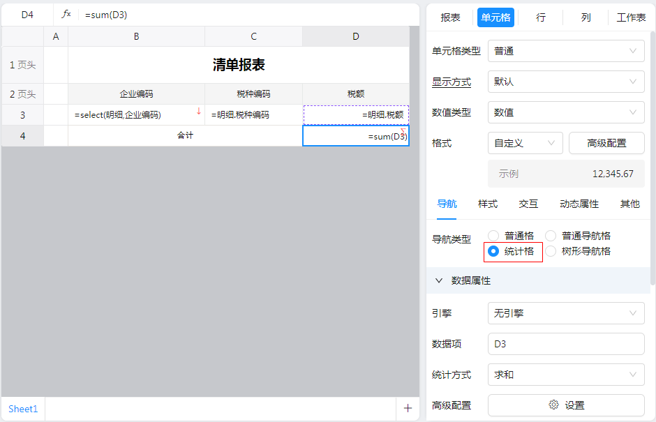 税种显示的是编码,想要显示名称的话,需要通过“动态公式”进行设置,属性选择“显示值”,设置条件选择字典数据源“税种”,配置好编码字段和显示字段即可。