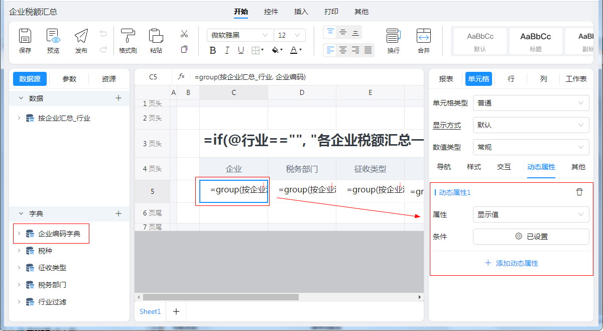 实现的方法是,把“企业编码字典”添加到该模板数据源的字典中,然后把该单元格的“显示属性”使用动态属性进行设置,表达式条件为: