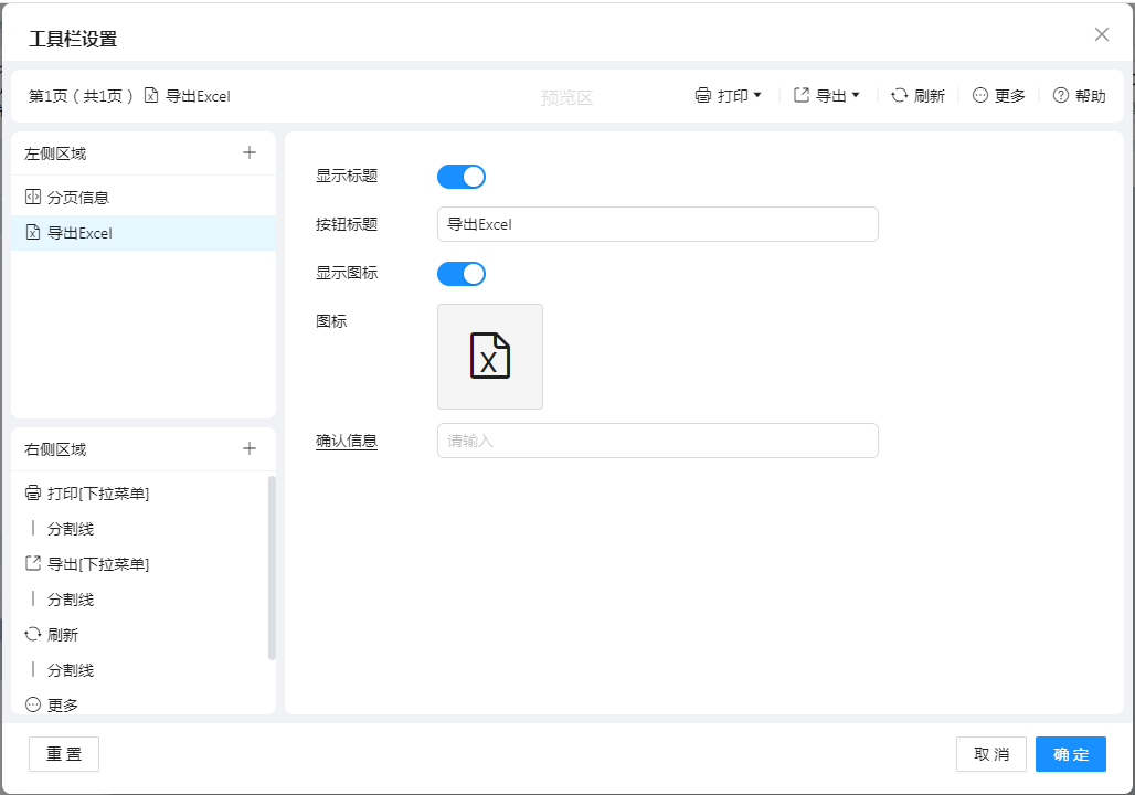 部分按钮支持个性化设置,添加到左侧或右侧区域的按钮选中后,右侧将显示对应的配置项,比如添加“导出Excel”按钮并为其进行设置,如下图: